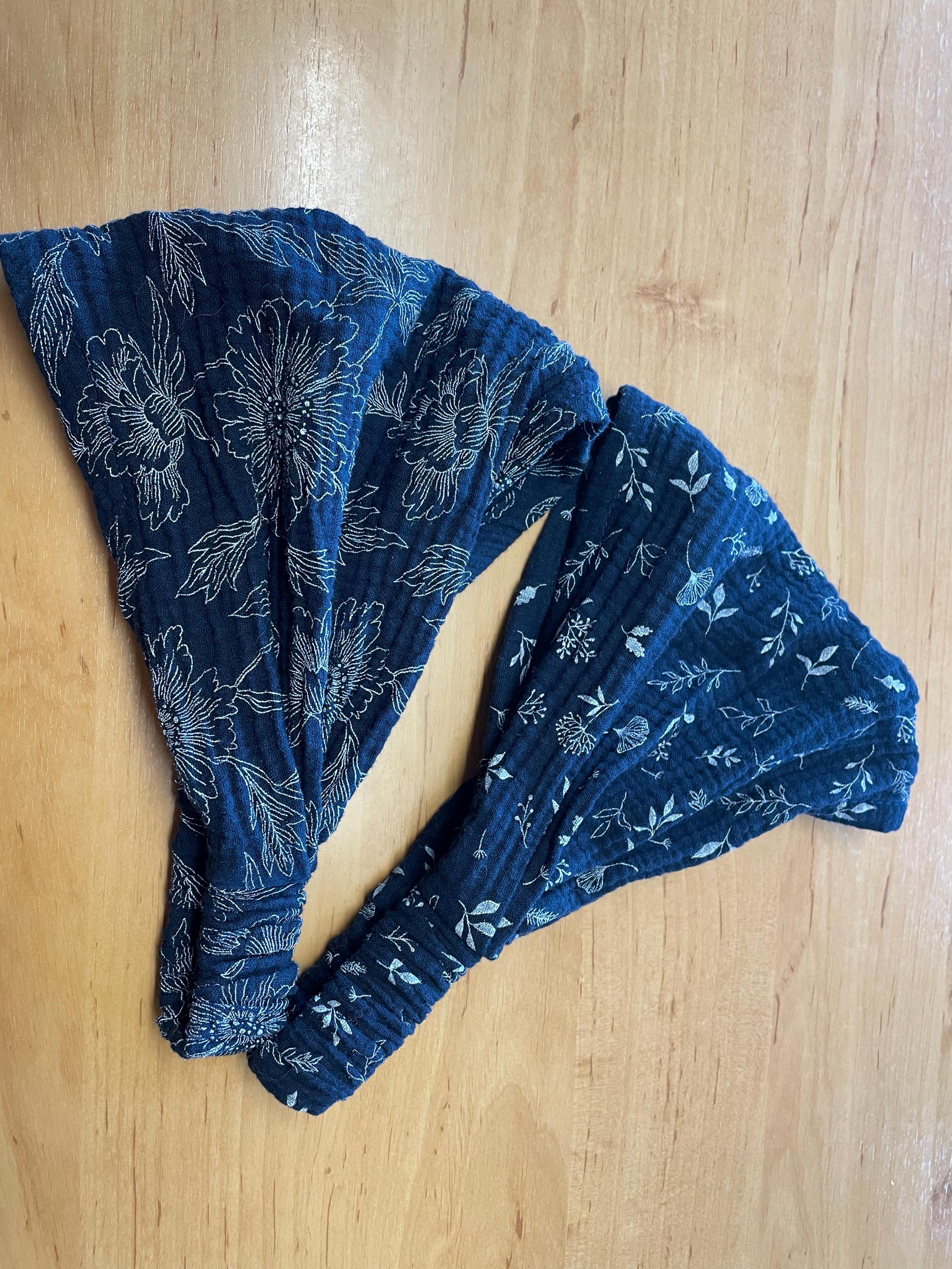 Cotton muslin bandana headband in dark blue, white, and floral.